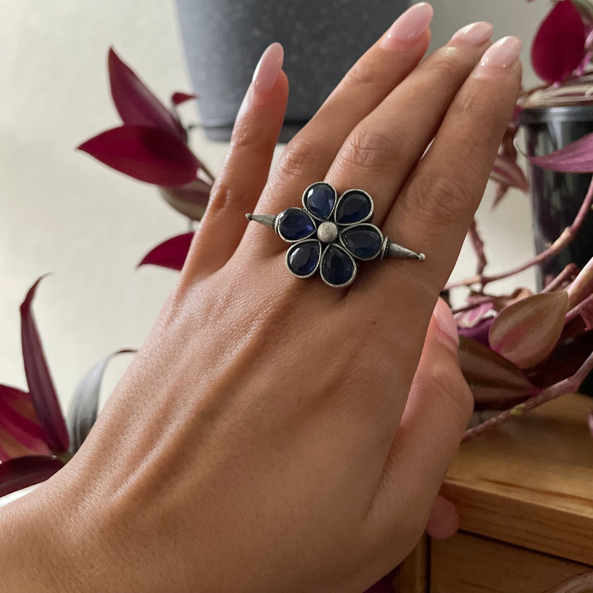 This eye-catching Faiza ring features a unique flower design, with coloured studs on the petals for added sparkle. The mix of metal and stones creates a stylish look that is sure to catch the eye.